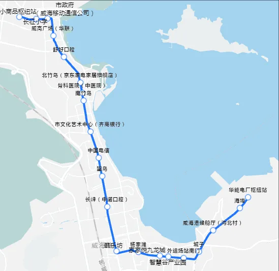 站点设置:华能电厂枢纽站、海埠、威海港候船厅(沟北村)、城子、外运场站南门、智慧谷产业园、家家悦九龙城、杨家滩、韩乐坊、长峰(中诺口腔)、望岛、中国电信、市文化艺术中心(齐商银行)、南竹岛、骨科医院(中医院)、北竹岛(京东家电家居旗舰店)、舒好口腔、威高广场(华联)、市政府(威海移动通信公司)、长征小学、小商品枢纽站共21站。